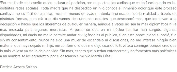 Después de escuchar las destempladas declaraciones de Patricia Acosta contra su nuera Dayana Jaimes, viuda de su hijo Martin Elias en las cuales le hace unas acusaciones temerarias y que hoy son tendencia en las redes porque se filtraron gracias a alguien que las grabo con su celular volvio a salir a la palestra Diomedes Díaz «El Cacique de la Junta» porque en un acto de contrición su primera esposa emitió un comunicado refiriéndose el espinoso tema pero en papelería del Cacique quien nada que ver porque esta descansando en el más allá hace más de dos años. Es el clásico de vivir a través de …..sus esposos, novios, hijos, parientes y demás. Algo muy común en algunas culturas universales. Afortunadamente se sostiene en sus declaraciones justificándolas por el dolor sentido al perder un hijo. ¡De acuerdo! puede ser una justificación válida. Pero como los duelos por pérdida de un ser querido son tan largos lo mejor seria ponerse una cremallera en los labios para evitar situaciones como la actual dónde se involucran solo mujeres: la Mona, Caya Barón; primera esposa de Martin; Dayana la viuda y la propia Patricia. Caya ha sido prudente en sus declaraciones. Pero hasta la mujer de Rolando Ochoa, acordeonero de Martín Elías ha tenido que contestar mensajes de Dayana quién en su dolor y anhelo de defender la memoria de su esposo está cazando peleas innecesarias. ¡cierren el pico para que no tengan problemas más adelante como el actual! Dejen ya descansar en paz al Cacique.