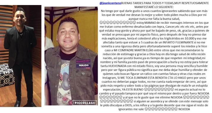 Se despacho Jean Carlo Centeno a través de su Instagram contra algunos de sus matoneadores en las redes, dónde a raíz de su notable bajón de peso le han formulado todo tipo de críticas y comentarios salidos de tono diciéndole entre otras ofensas que parece un enfermo terminal; que si tiene lepra; que tiene aspecto de desechable, etc, etc, etc. , todo lo que la imaginación y la opinión de esas seres sin rostro puede escribir sin ponerle cinco de sentido a lo dicho. Cualquiera se sale de sus casillas ante el matoneo sin sentido ni justificación. Ni que fuera el Santo Job. Jean Carlo se hizo la manga gástrica y ha sido muy efectiva dados los resultados tan notorios normales en cualquier persona que acude a este tipo de métodos agresivos. Naturalmente las consecuencias se notan en el rostro y el cuerpo. Recordemos a Jorge Alfredo Vargas, Martín Elías; Carlos «El Gordo» Benjumea; Jorge Rebollo a quienes todo el mundo criticaba cuando se veían enfermos por culpa de la baja de peso incontrolable. Duraron unos meses así. Hoy están divinamente y lucen regios. Igual pasará con Jean Carlo. Pero un consejo: no se deje sacar de las casillas cuando lee estos mensajes negativos. O, mejor no los lea. Piense únicamente en su más reciente éxito «Esta prohibido» que sigue cosechando éxitos a nivel internacional y continua siendo el más solicitado en muchas partes del mundo. No se estrese Jean Carlo, recuerde que usted es un personaje público y no se debe dejar colocar banderillas de ninguna clase. No caiga en esas trampas. Siga cantando y encantado con su voz.