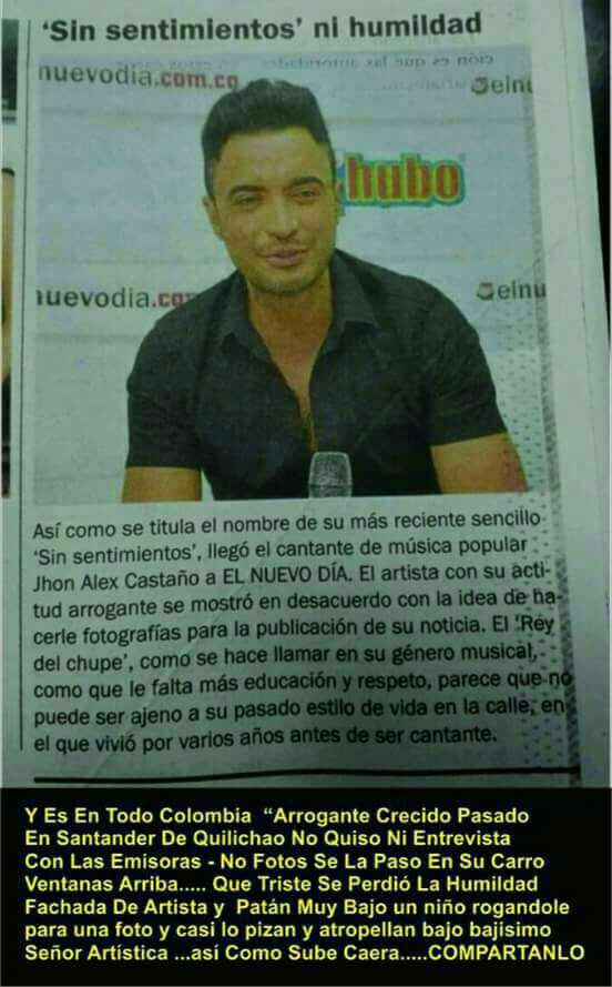 Es una verdadera lastima que uno de los cantantes de música popular mas reconocidos en el paìs ande de pelea con algunos medios de comunicación especialmente por la actitud asumida cuando han tratado de hacerle registro fotográfico para acompañar a las entrevistas promocionales de su más reciente trabajo discográfico. Le critican por ejemplo en Santander de Quilichao la negativa a bajarse de su carro para tomarse una foto con un pequeño admirador (un niño) quien pedía desesperadamente esta pequeña atención. Muchos pequeñines cantan a todo pulmón los éxitos del Pereirano que son muchos. Definitivamente es una actitud equivocada porque los artistas viven de la venta de sus discos los cuales se vuelven populares porque el público los escucha y en la medida que los adquieren van aumentando la popularidad del cantante y su tarifa de presentación en conciertos. En la medida que va trascendiendo la noticia del comportamiento del ídolo va creciendo su fama como la espuma al igual que su tarifa de tarima. Ellos son los que finalmente se meten la mano al dril para comprar la boletica o el disco ya sea en las plataformas digitales o físicos. No queremos pensar que Jhon Alex anda a la defensiva por el reciente escándalo de su separación con su esposa Patricia porque sus seguidores no tienen que pagar los platos rotos de esta suceso. ¡Ojo! Jhonn Alex que cada día surgen más cantantes de música popular y la competencia se torna más fuerte. Cuide su público, cuide su público porque ese es su capital. Recobre su sencillez, humildad y amabilidad que siempre lo caracterizan y dejaron una excelente imagen entre su público.