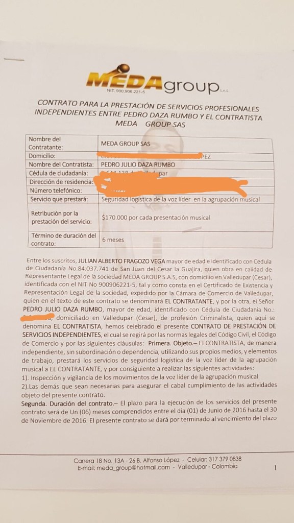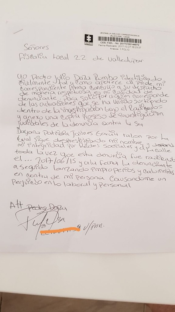 La segunda contra la «Organización Musical Meda» cuyo representante legal en vida era Martin Elias Diaz Acosta (q.e.p.d) para que le reconozan y se le paguen las sumas de dineros correspondientes a los siguientes derechos «reconocimiento y pago de las prestaciones sociales» por el tiempo trabajado en la empresa de Martin( anexa contratos firmados por sus servicios) y la última contra Dayana Jaime Garcia y Reynaldo Hinojosa, por falsa denuncia y amenazas con arma de fuego basada en los hechos del 14 de noviembre acaecidos en la Sastrería Corzo de la ciudad de Valledupar.