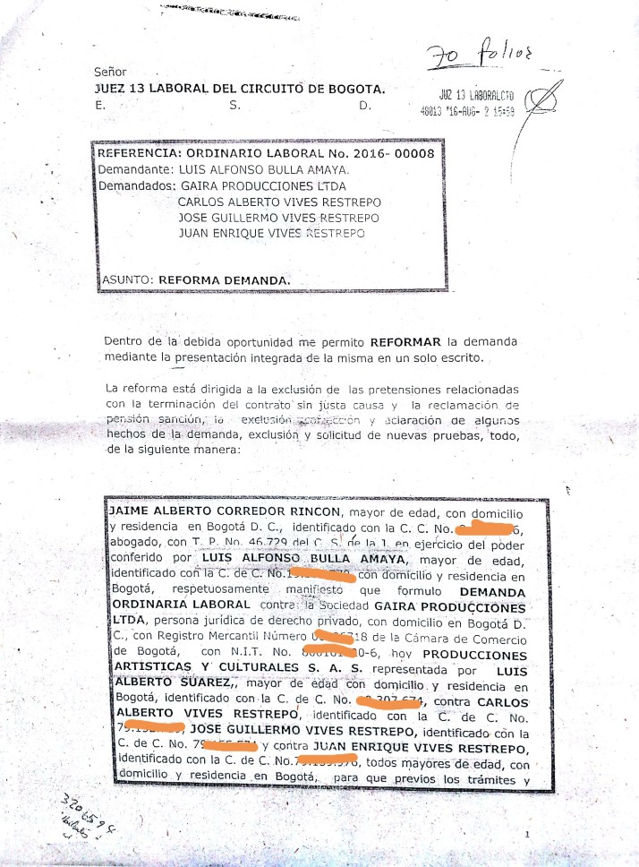 Es un pleito de vieja data, ya lleva por lo menos cuatro años y no se resuelve hasta el momento. La demanda laboral es de Luis Alfonso Bulla Amaya, contra Gaira Producciones Ltda., por la liquidación de prestaciones correspondientes a los servicios prestados por el señor Bulla con un contrato verbal de trabajo a término indefinido empezado el dos (2) de abril de 1.992 y finalizado el 31 de octubre de 2012. La nuez del asunto es que se le deben liquidar con base en Cinco millones de pesos M/cte. más lo que se declare por concepto de bonificaciones, comisiones y otros beneficios a que tiene derecho el demandante como trabajador de la sociedad demandada. Lo cierto es que ahora solicitan REFORMA de la demanda y las cosas se siguen dilatando porque por los lados de los representantes de Gaira no se presentan a las citaciones solicitando a última hora aplazamientos de acuerdo con la versión del demandante. Esto está pasando de castaño a oscuro y aunque Gaira pertenece a los hermanos Vives, entre ellos Carlos no lo culpan directamente a él sino a sus Abogados. La verdad es que ya es tiempo de cerrar éste capítulo. ¿No les parece?