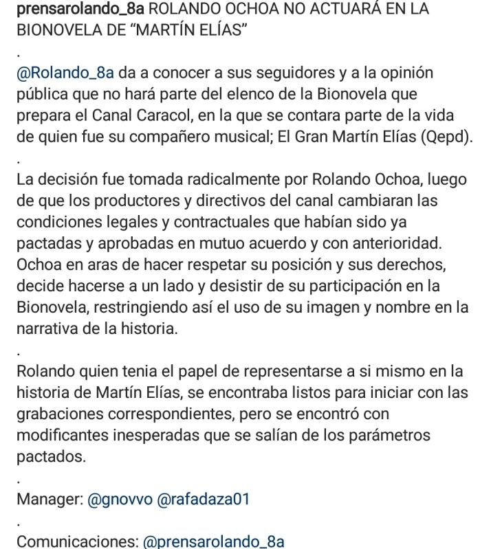 Se produjo importantísima renuncia además irrevocable en el elenco de la novela «La generación de los Díaz» que ya se está grabando en el municipio de Honda. Y no es cualquier pérdida. Se trata nada más y nada menos que la de Rolando Ochoa R-8 uno de los íconos de la nueva generación de compositores, productores y acordeoneros vallenatos quién era la pareja musical de Martín en el momento de su fallecimiento y quién lo ayudó llevándolo a la Clínica en esos trágicos momentos. El había firmado contrato con Caracol para interpretarse a sí mismo. De acuerdo con comunicado expedido por su Oficina de Prensa, la drástica decisión se debe entre otras razones a «que los productores y directivos del Canal cambiaron las condiciones legales y contraactuales que habían sido ya pactadas y aprobadas de mutuo acuerdo y con anterioridad». Ochoa en aras de hacer respetar su posición y sus derechos, decide hacerse a un lado y desistir de su participación en la bionovela, restringiendo así el uso de la imagen y nombre en la narrativa de la historia. Otro inconveniente más en la producción de la accidentada novela que ha tenido cualquier cantidad de obstáculos desde el momento de la propuesta. «Supuestamente» una de las causas es el cambio de locación. Ya no es en Valledupar sino en Honda. Nada que ver, así se parezca mucho la arquitectura. Ahora a correr buscando el reemplazo de R-8. Los dejó colgados de la brocha. Rolando era uno de los imanes para el público televidente. Veremos, veremos quién lo logra. Duro golpe para la producción y la novela del «Gran Martin Elias». Aquí el comunicado oficial: