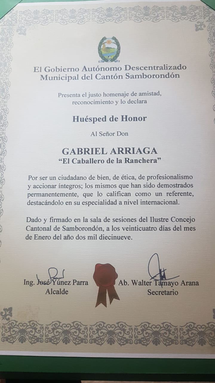 Aclara el reconocido intérprete de música ranchera Gabriel Arriaga quién llegó la noche de éste 28 de enero del 2019 procedente de Ecuador en el cual se presentó con lleno total y condecoración a bordo por parte de las autoridades municipales del Cantón Samborondón de una «supuesta» demanda de la señora Yovana Lozada en su contra por el negocio de un caballo en el cual no tiene ni arte y parte, lo cual es mentira, una falsedad.
