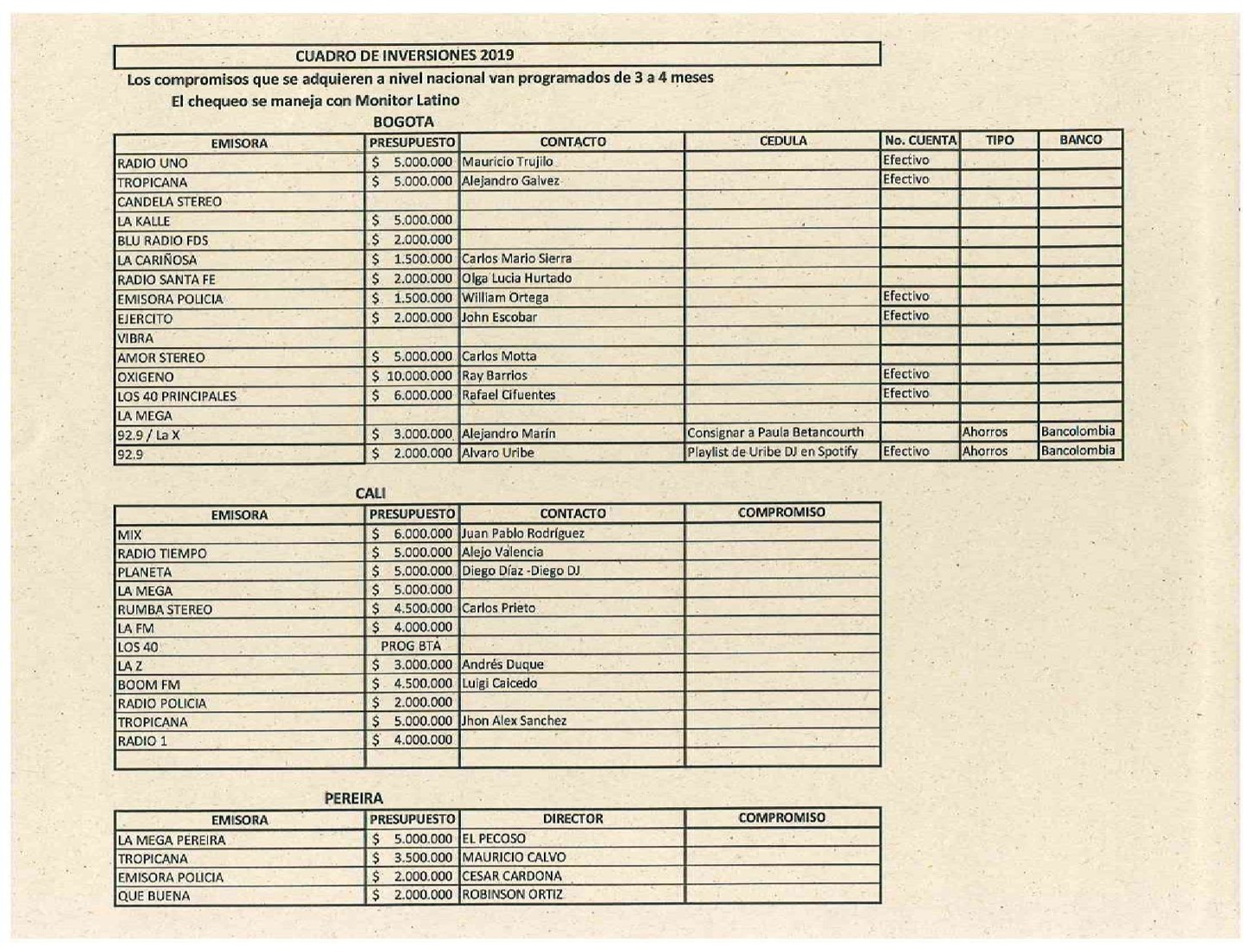 Aunque el cuento de la «payola» es de vieja data ahora cobra importancia por el informe de la llamada «Liga contra el silencio» publicado éste fin de semana con nombres propios. Revolución en el medio, ¿pero será que pasa algo?. ¡Lo dudo mucho!. La Nasa de las cadenas radiales lo saben, y se hacen los de la vista gorda, miran para otro lado. Los echan solamente cuando son cogidos en flagrancia como sucedió con Boris Zeta ex-R.C.N., solicitando una casa a un grupo Mexicano a través de su P.C.. Pero contaditos con los dedos de las manos quienes no solicitan payola. Eso es costumbre aceptada en el medio. Después del primer informe sale ahora uno mucho más completo organizado por ciudades, con nombres propios, tarifas, números de teléfonos, cuentas de banco y a quién se le consigna. Lo denominan el «Santo crial de la payola». Interesante la de Bogotá dónde figuran las principales emisoras como Radio Uno; Tropicana; La Kalle; Blu Radio; La Cariñosa; Radio Santafé; Emisora de la Policia; Ejército; Amor Estereo; Oxigeno; 92.9; La «X», Olimpica. Son las más costosas. Falta para completar la información, quienes reciben «payola» para bloquear a la competencia de los cantantes poderosos y compran a los encuestadores de direccionar algunos votos para su emisora en detrimento de la real. Hasta demandas hay por ésta razón. A la «Negra Candela» se la interpuso Jota Fernando Quintero por denunciar todo esto hace ya varios años. Ante la evidencia abrumadora tuvo que retirarla. Pero ese temita es un pozo sin fondo dónde hay mucho para sacar a la luz. Ojala y se le pongo remedio a ésta deshonesta práctica que perjudica a los cantantes y al medio. Que se pronuncien los implicados porque una cosa es recibir dinero en efectivo a titulo personal y otra las negociaciones para satisfacción de los oyentes como presentaciones, conciertos y demás. Eso dicen algunos. Veremos quien tiene la razón.