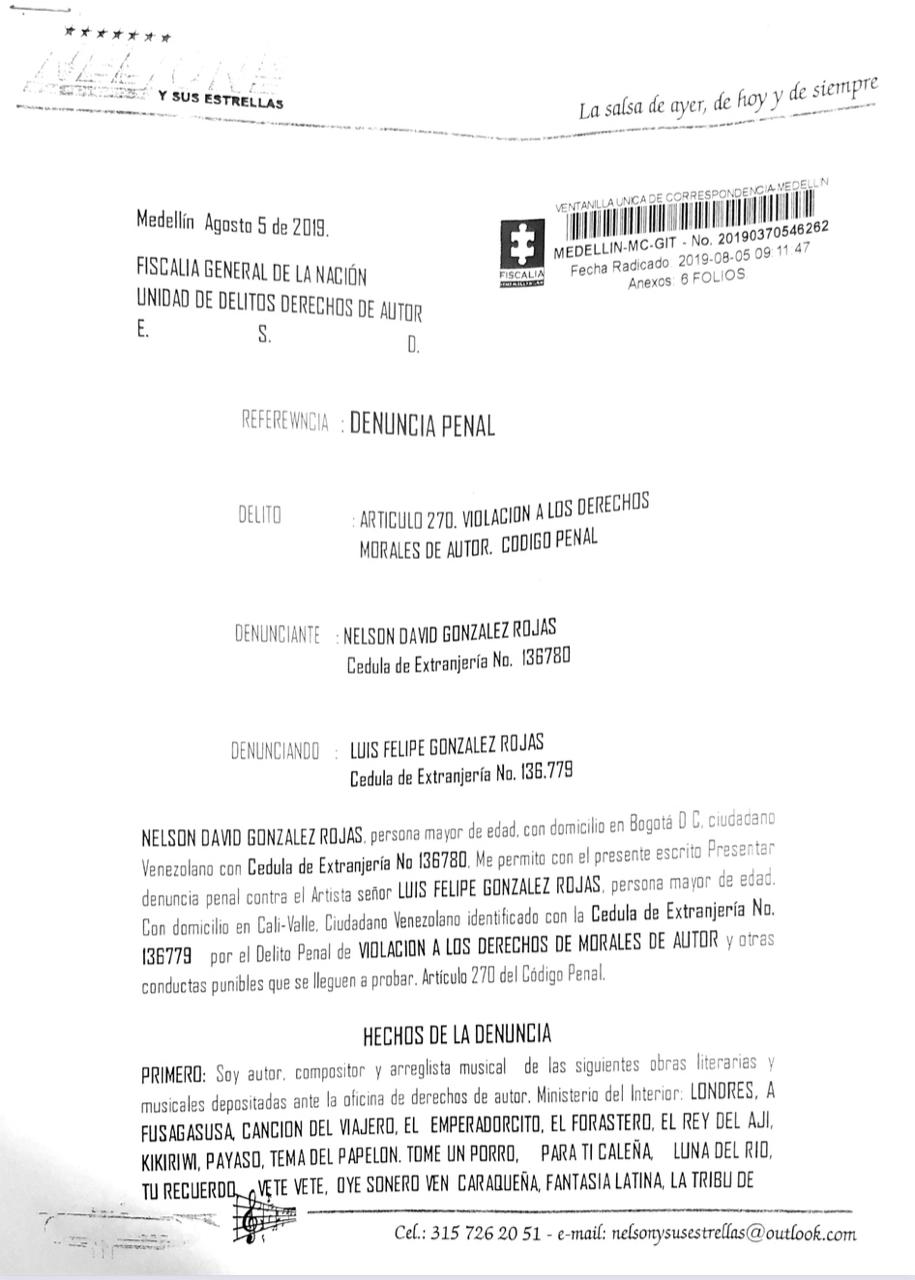 ¿Quién no ha oido y bailado «El emperadorcito», «Payaso», «Para ti caleña», «San Fernando», «Luna del rio», «Kikirimu», «Tema del papelón», «La Sirena» e infinidad de éxitosos temas más en la voz de Luis Felipe González Rojas de nacionalidad Venezolana y quien pasa más tiempo en nuestro pais que en el propio? Diriamos que tres generaciones de Colombianos. Sin embargo y como van las cosas luego de la demanda interpuesta por su hermano Nelson David Gonzalez Rojas en la Fiscalia General de la Nación el pasado 5 de agosto en la ciudad de Medellin por «Violación a los derechos morales de autor» Artículo 270 del Código Penal, no volverán a hacerlo, por lo menos interpretados por Luis Felipe. Nelsón David, el dueño de la agrupación «Nelsón y las estrellas» solicita que se le prohiba a su hermano mayor volver a cantar las composiciones de él, de las cuales además es el arreglista, porque a pesar de su negativa Luis Felipe las entonó en la «Fonda de mi tierra» dentro de la «Feria de las Flores» ocasionandole pérdidas a su agrupación orquestal. La pelea legal apenas comienza pero es una verdadera pena que se peleen entre hermanos que han sido tan triunfadores y con tanto reconocimiento en su país de origen Venezuela, Colombia y el mundo que los admira. Todo por los derechos de autor que supuestamente Luis Felipe no le reconoce a Nelsón. Esperemos concilien. Pierden sus seguidores.