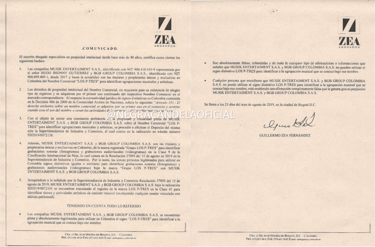 Un jarto enfrentamiento están viviendo un reconocido artista de música tropical y unos famoso y respetado empresario del mundo musical Colombiano por un contrato profesional incumplido según el señor Jhonny Gutiérrez, dueño de la marca «Musik Entertaiment S.A.S» y BGB Group Colombia S.A.S. y el cantante Iván, el mismo «Iván y sus bam-bam» quién ha salido en defensa de los intereses de su hijo David Juan, cantante también y hasta hace poco integrante de la agrupación «LOS P-TRES» de la cual salió por faltas disciplinarias de acuerdo con Jhonny Gutiérrez lo cual le significa una abultada multa de ciento treinta millones de pesos ($ 130.000.000) y la pepa de la pelea. De acuerdo con Iván la empresa Musik no puede hacer presentaciones en vivo en Colombia con la orquesta porque la resolución 37095 del 15 de Agosto del 2019 de la Superintendencia de Industria y Comercio únicamente la autoriza para identificar grabaciones sonoras (fonogramas) y grabaciones audiovisuales (videogramas) bajo la marca «Grupo LOS P-TRES» no conciertos. De acuerdo con el comunicado expedido por el doctor Guillermo Zea Fernández, considerado la mayor autoridad en Colombia en «Derechos de autor», los dueños de la marca pueden hacer con ella lo que a bien crean conveniente. La situación se complica porque Iván tiene un contrato verbal para reactivar su carrera músical con Hugo Gutiérrez reconocidísimo hombre de la música en el pais, papá de Jhonny y quién ahora está pagando los platos rotos porque desde el inicio de éste conflicto Iván no le ha vuelto a contestar el teléfono y eso que Hugo fué el creador del éxitoso «Iván y sus bam-bam» cuando trabajaba en Sonolux. ¿No será mejor arreglar por las buenas?