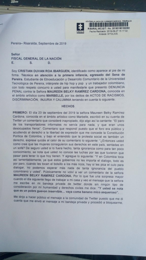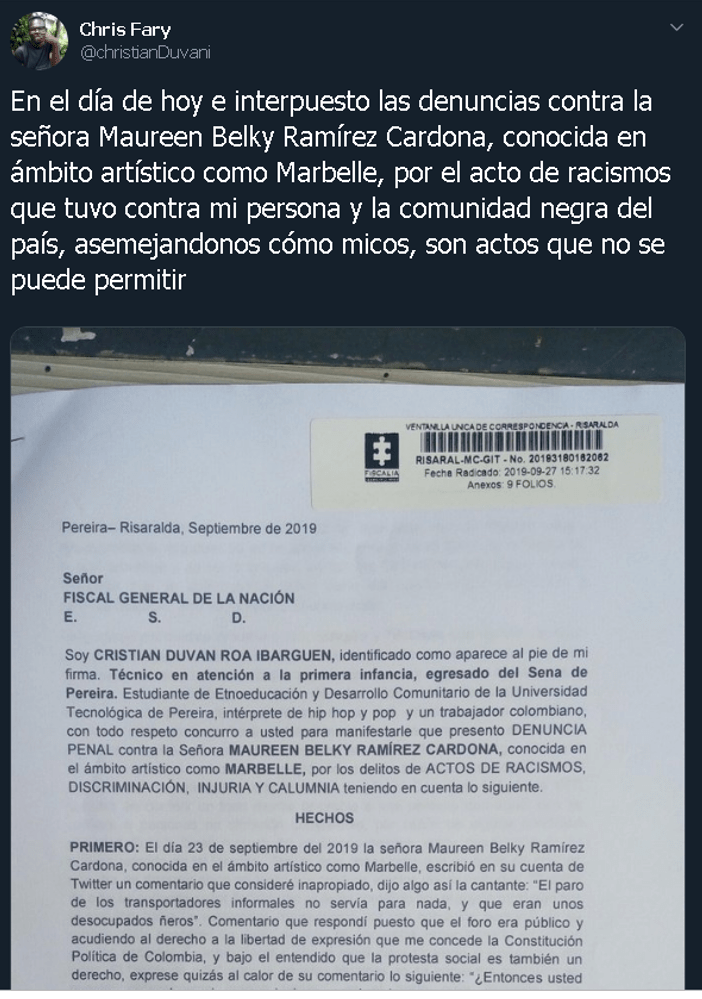 Fué uno de los escándalos en la farándula Colombiana la semana anterior. El enfrentamiento entre Marbelle y un seguidor afro por un cruce de trinos uno de ellos «Y usted se nota que es un pobre güevon inservible…vaya coma banano mico asqueroso», escrito por Marbelle. Ahi fué Troya. La comunidad afro-colombiana se indignó y solidarizo con el insultado. Un chico intérprete de hip-hop, egresado del Sena de Pereira, Técnico en atención a la primera infancia, estudiante de Etno – educación y Desarrollo comunitario de la Universidad Tecnológica de la capital Risaraldense quién ya instauró ante la Fiscalia General de la Nación la demanda contra ella por «Actos de racismo, discriminación, injuria y calumnia», lo cual enredará a la presentadora un tiempito a no ser que se dé una conciliación rápida en la fiscalia. Pero la cosa se alarga, porque en la descripción de los hechos Cristian Damian Roa Ibagüen narra cual fué el origen de la agresión. Según él se molesto con un trino escrito por ella que decía más o menos ésto: «El paro de los transportadores informales no servia para nada y que eran unos desocupados ñeros». Esto en lugar de amainar se incendia más porque los conductores no están nada contentos con éstá aseveración de una de sus intérpretes preferidas. Cristian agrega «que si bien Marbelle le pidió disculpas a la comunidad afro Colombiana jamás lo hizo con él a titulo personal quién es el ofendido». Veremos en que termina todo éste lío. Pero la demanda se cristalizo. Muchos pensaron que era sólo chicaneria del muchacho que quería aprovechar sus cinco minutos de fama. Pues no, está demostrando con la demanda que la cosa va en serio, muy, pero muy en serio tanto que algunos Abogados de la comunidad están considerando la posibilidad de hacer lo mismo a nombre de su gente a pesar de las disculpas de ella en «Lo sé todo».