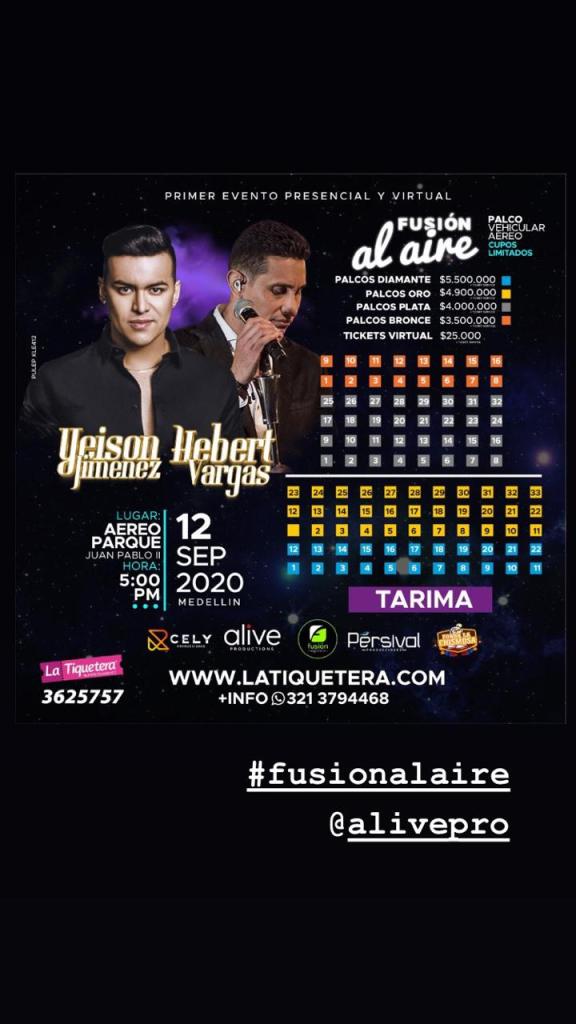 Se lanzan al agüa mañana en la ciudad de Medellin, los empresarios de «Fusión al aire», en Medellin con el primer auto-concierto en el cual presentaran a Yeisson Jiménez y Hebert Vargas, cantantes de música popular el primero y vallenato el segundo. Eso si, ampliamente reconocidos en el país y algunos fuera de él. El sitio será el Aeroparque Juan Pablo II, con capacidad para 110 vehículos que parquearán debajo de una plataforma personal a la cual subirán cuando desciendan del carro para disfrutar del show celebrado en una tarima de más de tres metros de altura. La novedad es la logistica y la implementaciòn. Cada plataforma tiene su baño propio al cual accederán máximo ocho personas de acuerdo con el tamaño y la capacidad del vehículo. La propuesta es novedosa y recursiva. Sin embargo los empresarios estaban medio aburridos porque en medio de tantos conciertos virtuales se cancelaron varios anunciados y los taparon con imágenes promocionales del de ellos. De manera que están contándole a todo el mundo que su concierto se llevará a cabo éste sábado 12 de septiembre del 2020, si o si, de manera presencial y virtual en la capital antioqueña y luego irán a Cali y Bogotá con la misma tecnología. Bien por ellos encontraron una solución a la crisis del entretenimiento en conciertos.