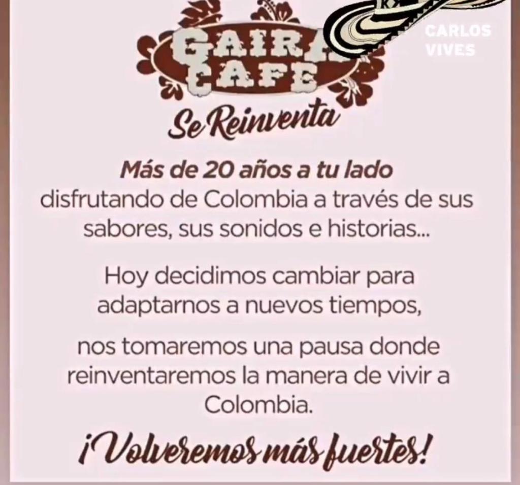 Si, se confirman los rumores del cierre del Restaurante de los Hermanos Vives, «Gaira Café», con más de veinte años de funcionamiento y sitio obligado para los Bogotanos y visitantes gustosos de la comida costeña e internacional que además de ser deliciosa siempre iba acompañada de un excelente show musical con intérpretes de primerísimo nivel. La situación comenzó hace algunas semanas cuando Guillermo Vives, alma del sitio junto con su progenitora doña Araceli, subió un post a las redes dando el primer signo de alarma por las diferencias con sus socios entre los cuales se encuentra su hermano Carlos y de una persona que estaba interfiriendo en un proyecto familiar construido para asegurar la estabilidad económica de la familia. Después comenzaron a filtrarse las afugias económicas derivadas de la cuarentena por el Covid 19, hasta ahora cuando ellos mismos envían un comunicado en el cual cuentan la decisión de cerrar «temporalmente» mientras se reinventan. Regresarán dicen en el mismo comunicado, pero no dan una fecha. Esta noticia cae como un baldado de agua fría entre sus habituales. Seamos optimistas para que no sea por mucho tiempo y cuando lo hagan con todos los problemas solucionados. Cierre es cierre así sea temporal y para reinventarse.