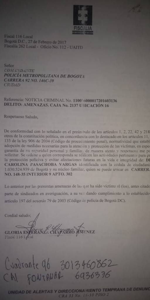 Aunque los señalamientos con videos incluidos de dos jovencitas contra el señor César Andrés Calderon Romero «Yo me llamo Vicente Fernández» por acoso sexual levantaron polvareda en su momento, desatando un escándalo mediático,. lo cierto es que paso como nube de verano y el público ya lo olvido. Sin embargo Diana Carolina Pasachoba Vargas NO. Porque ella le tiene instauradas ante la Fiscalia General de la Nación demandas por amenazas contra su vida y la de familiares por parte del citado cantante de música ranchera. Tan grave es la situación que «la Fiscal 116 Local solicito ante la Policia Metropolitana de Bogotá «para que realicen as actividades necesarias para la protección de las víctimas…..y evitar afectaciones futuras en la vida y en la integridad de Diana Carolina Pasachoba Vargas y sigue…