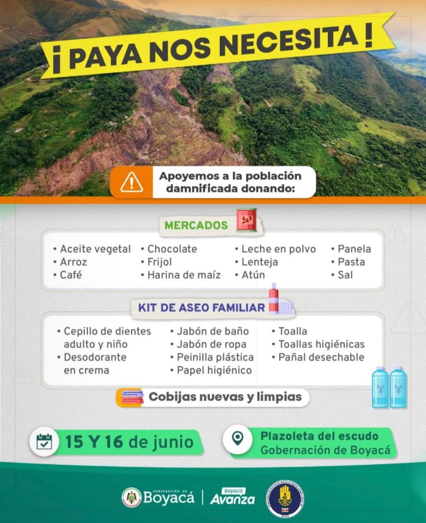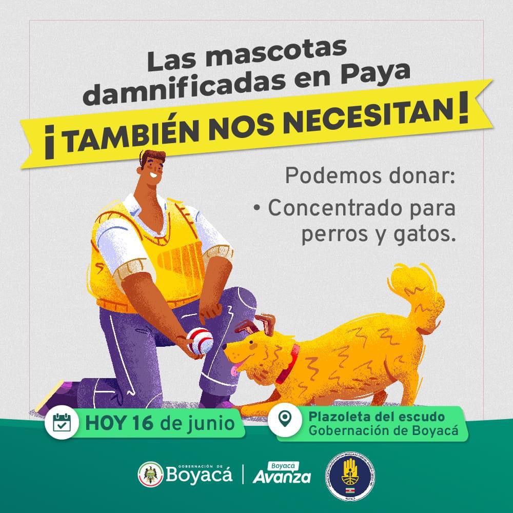 Hoy viernes se está llevando a cabo en la Plazoleta del Escudo frente a la Gobernación de Boyaca una campaña de solidaridad con los damnificados de la vereda de Paya, arrasada por una avalancha y necesitan de ayuda de la comunidad. Piden para ellos y las mascotas abandonadas por culpa del fenómeno natural. Ellos también son «seres vivos».