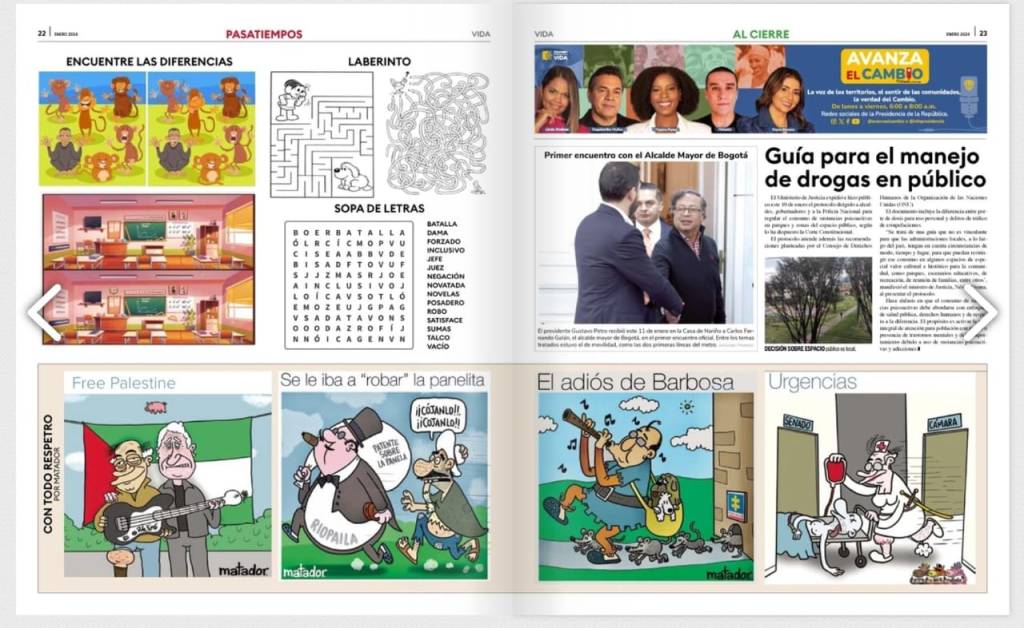 Uno de los escándalos del momento es la circulación del periódico “VIDA” por cuenta del actual Gobierno que saldrá en seis emisiones durante el año 2024 con una alta inversión, supuestamente de los dineros de los contribuyentes que han puesto el grito en el cielo porque no están de acuerdo en que sus impuestos financien esta propuesta. Independientemente del la orientación política de quien lo vea lo cierto es que después de leerlo atentamente se nota el cuidado en la redaccion y edición con noticias obvio de realizaciones positivas del Gobierno y, quien lo creyera con algunos columnistas reconocidos por los Colombianos como Gustavo Alvarez Gardeazabal, Yessid Arteta, José Félix Lafourie, Margarita Rosa de Francisco, Milton Rengifo, dirección de Fernando Millan y el regreso del reconocido caricaturista “Matador” quien tuvo un receso en la gran prensa luego de su salida de “El Tiempo” por la puerta de atrás por un problema del pasado con su esposa. La sorpresa precisamente es esta, el llamar a personas críticas de su gestión en otros medios como quien dice “trabajando con el enemigo”. Un verdadero harakiri. La distribución ha sido eficiente porque hoy iniciando su circulación ha llegado a personas claves en todos los campos, incluidos los medios. Que se sepa hasta el momento es gratuito para quien lo reciba en Cali, Barranquilla, Medellín y Bogota. En la medida que avance irá a otras ciudades de la provincia claves del país. Veremos cómo le va y cual es la opinión de otros sectores que ocasionalmente visibilizan los grandes medios.