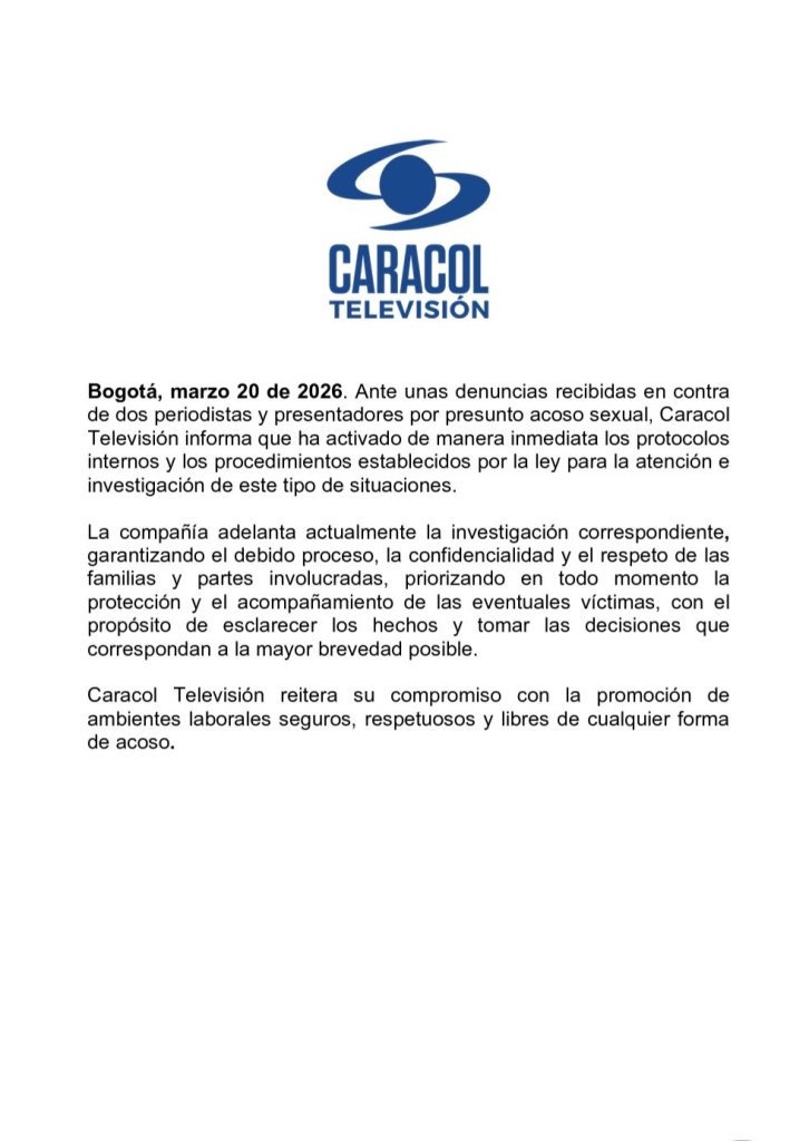 De acuerdo con información filtrada desde finales del año 2025, en Caracol TV. estaban muy preocupados por quejas llegadas a través de las redes principalmente sobre acosos a personas al interior de la empresa como a televidentes que manifestaban su admiracion a algunos de ellos que los veían como sus ídolos quienes se quejaban de las respuestas de los mismo quienes equivocadamente utilizaban la información para molestarlos. Por eso estaban investigando la certeza de los reclamos porque iban a cortar con esa situación injustificable para la empresa. Los señalados no son solamente los mas obvios sino de otro perfil. Verdaderas estrellas. Por eso hay conmoción con un comunicado impreso en paoel con el logo de Caracol en el cual se lee que están espulgando a dos reconocidos presentadores de la empresa por estos señalamientos. No hay ningún nombre. Aunque se esta especulando con los de dos famosisimos periodistas y presentadores de noticias. Veremos que tan cierto es el comunicado y no resulte ser inventado por la IA.